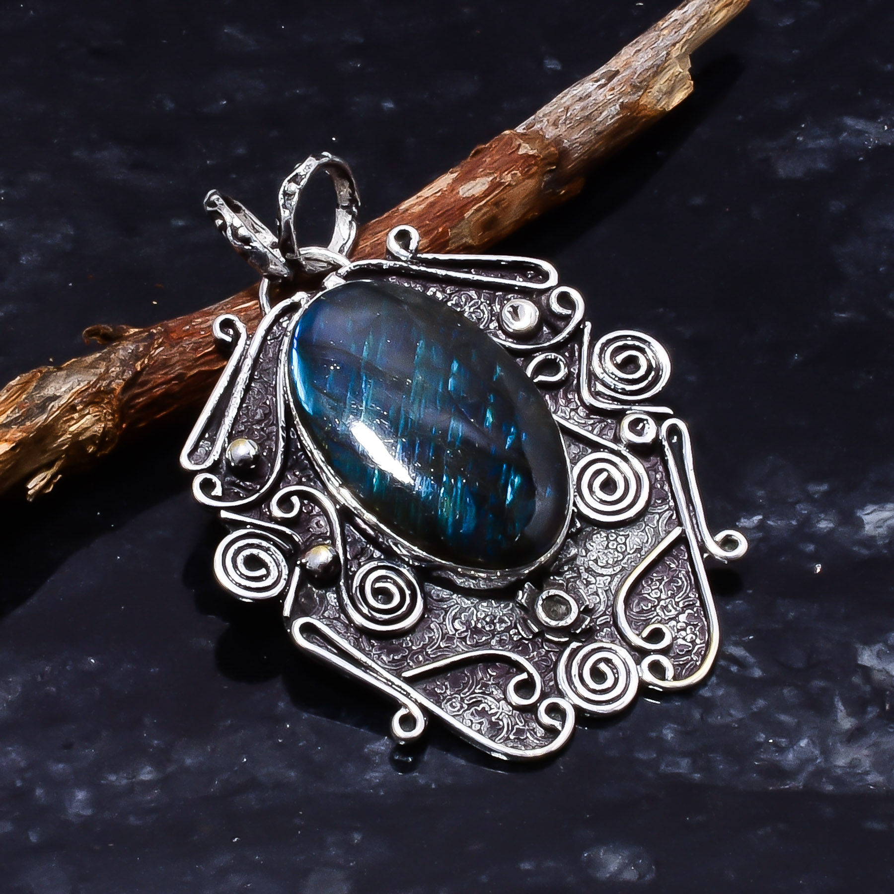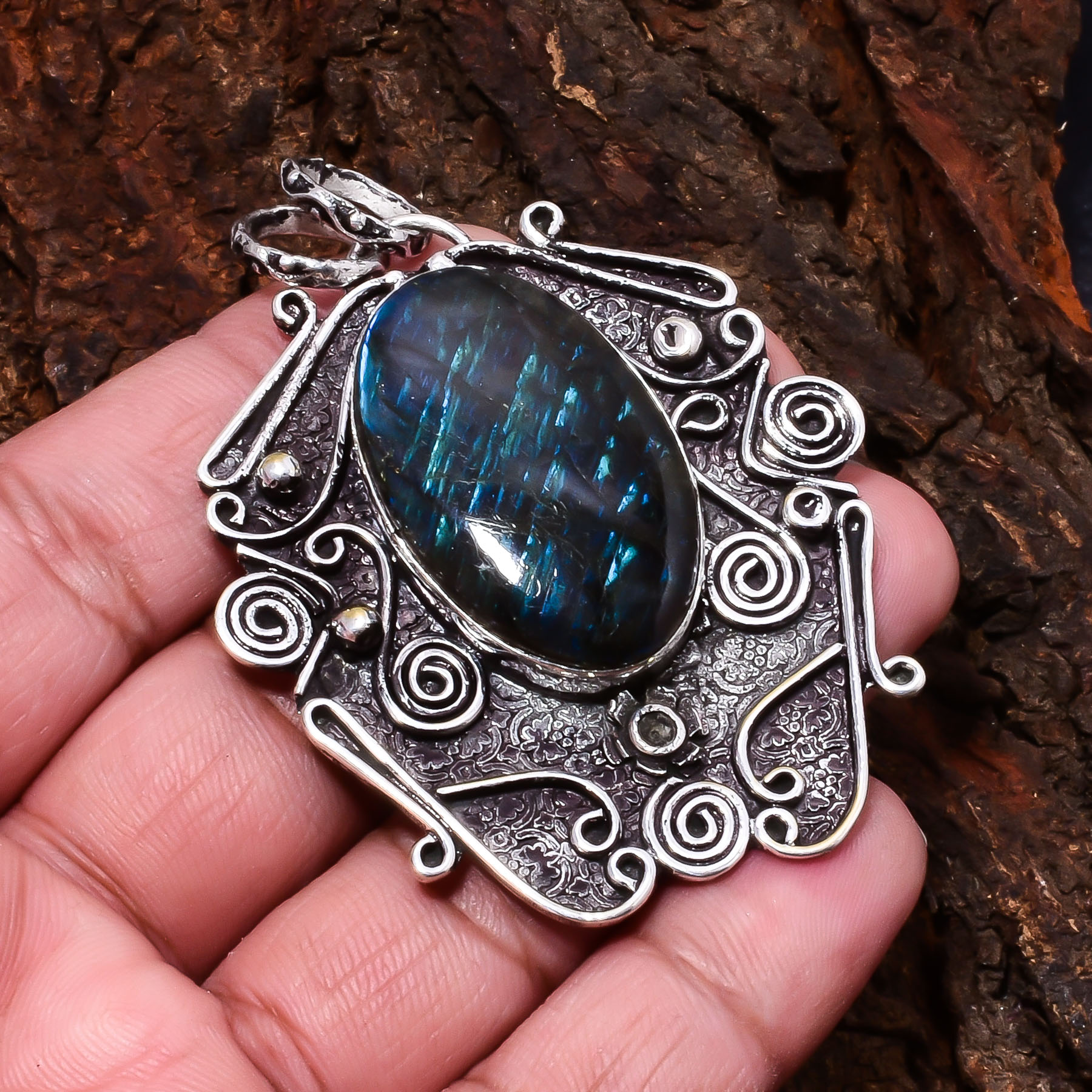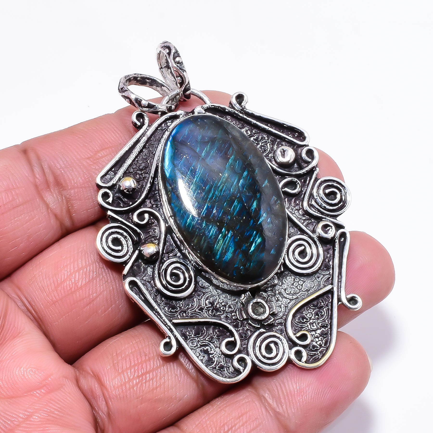 Handcrafted Large Blue Labradorite Gemstone Pendant in 925 Sterling Silver by Nakshmart. This striking pendant features a natural labradorite stone with vivid blue flash, elegant silver detailing, and timeless handmade artistry — perfect for gifting or daily elegance.