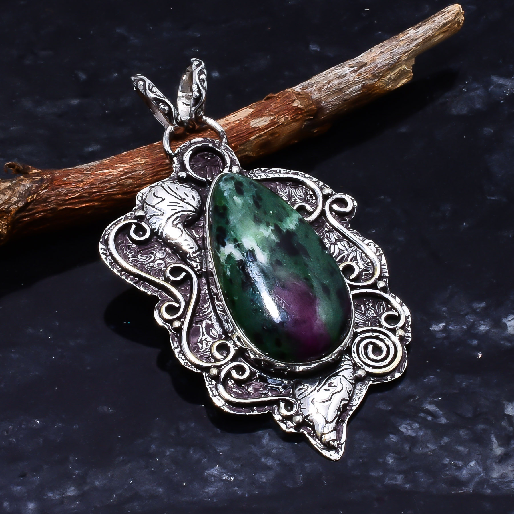 Handcrafted Ruby Zoisite Gemstone Pendant in 925 Sterling Silver by Nakshmart. This natural green and pink gemstone pendant blends the energies of ruby and zoisite, featuring elegant silverwork and timeless handmade design.